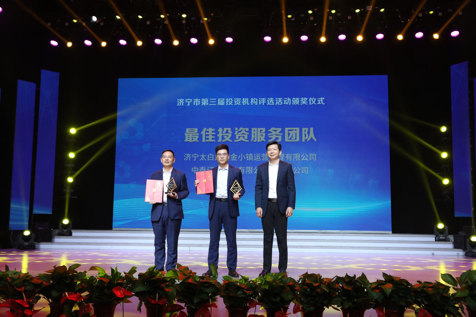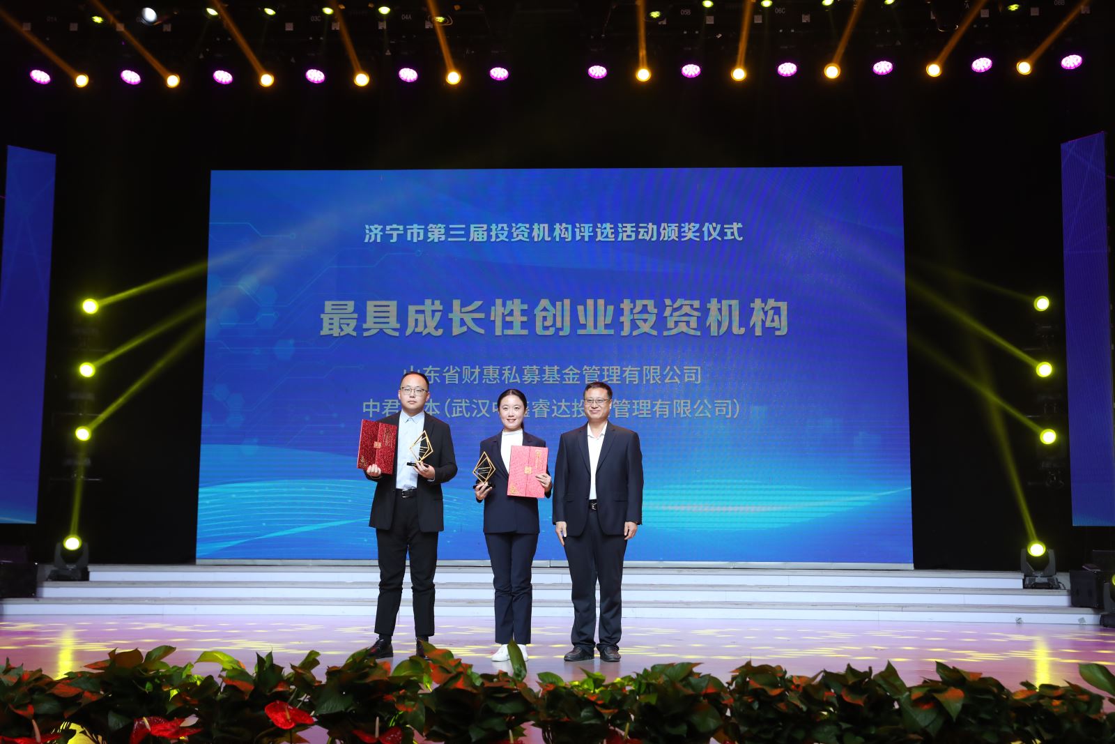 随后,现场依次揭晓并颁发了三大类奖项,分别是为济宁市做出突出贡献的股权投资机构TOP2、最具成长性创业投资机构TOP2与最佳投资服务团队TOP2。山东科创投资有限公司、济宁国投资产管理有限公司、济宁太白湖基金小镇运营管理有限公司等六家机构荣登榜单,树立了服务实体经济与科技创新的行业标杆。